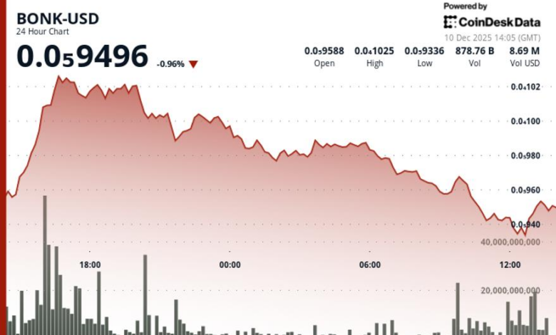 The Solana-based memecoin rallied to $0.000010273, where volume jumped 137% above the 24-hour average to 1.61 trillion tokens during an attempted test of overhead resistance, according to CoinDesk Research’s technical analysis data model.