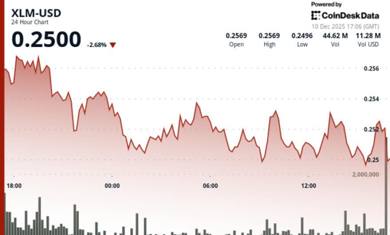 Price action revealed distinct two-phase trading on Wednesday. XLM consolidated around $0.251 through early afternoon before plunging to $0.2492, then recovering methodically to $0.2502.