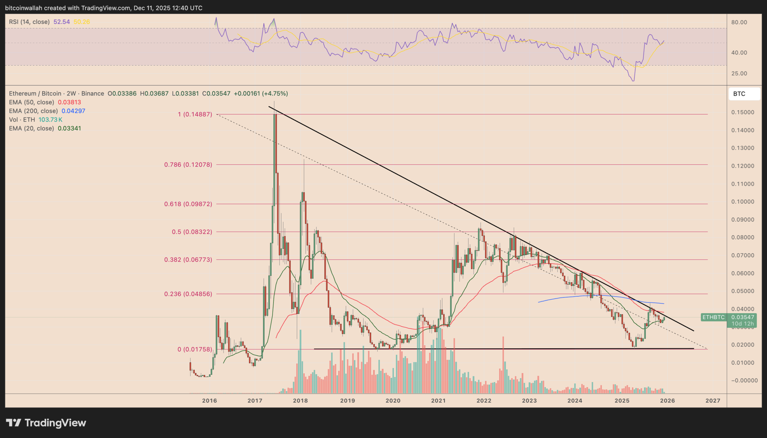 Ether remains capped by a multiyear descending trendline that has rejected every breakout attempt against Bitcoin since 2017.