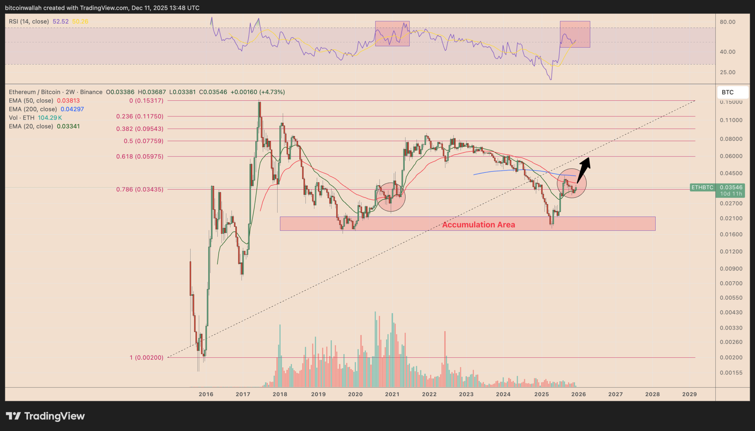 Ethereum’s Ether (ETH) token may rally by over 80% versus Bitcoin (BTC) in 2026, according to a classic bullish reversal scenario developing on its long-term charts.