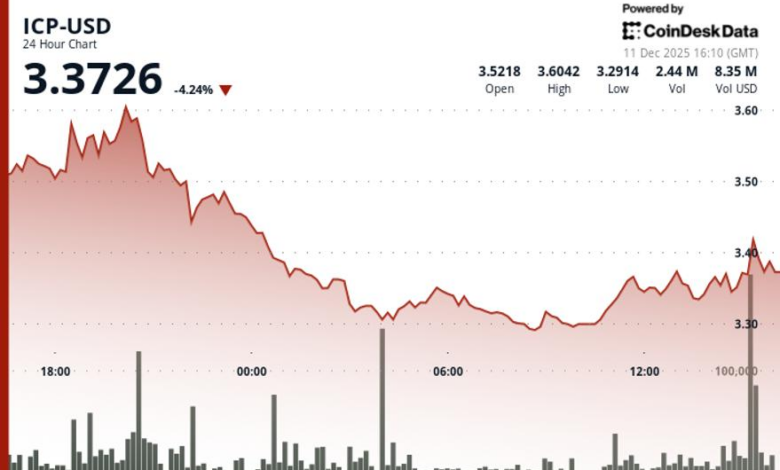 ICP declined 4.28% over the past 24 hours, sliding from $3.52 to $3.3735 in a session defined by a sharp early reversal and sustained downward momentum.