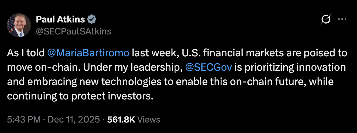 “US financial markets are poised to move onchain,” SEC Chair Paul Atkins said on Thursday, adding, “Onchain markets will bring greater predictability, transparency, and efficiency for investors.”
