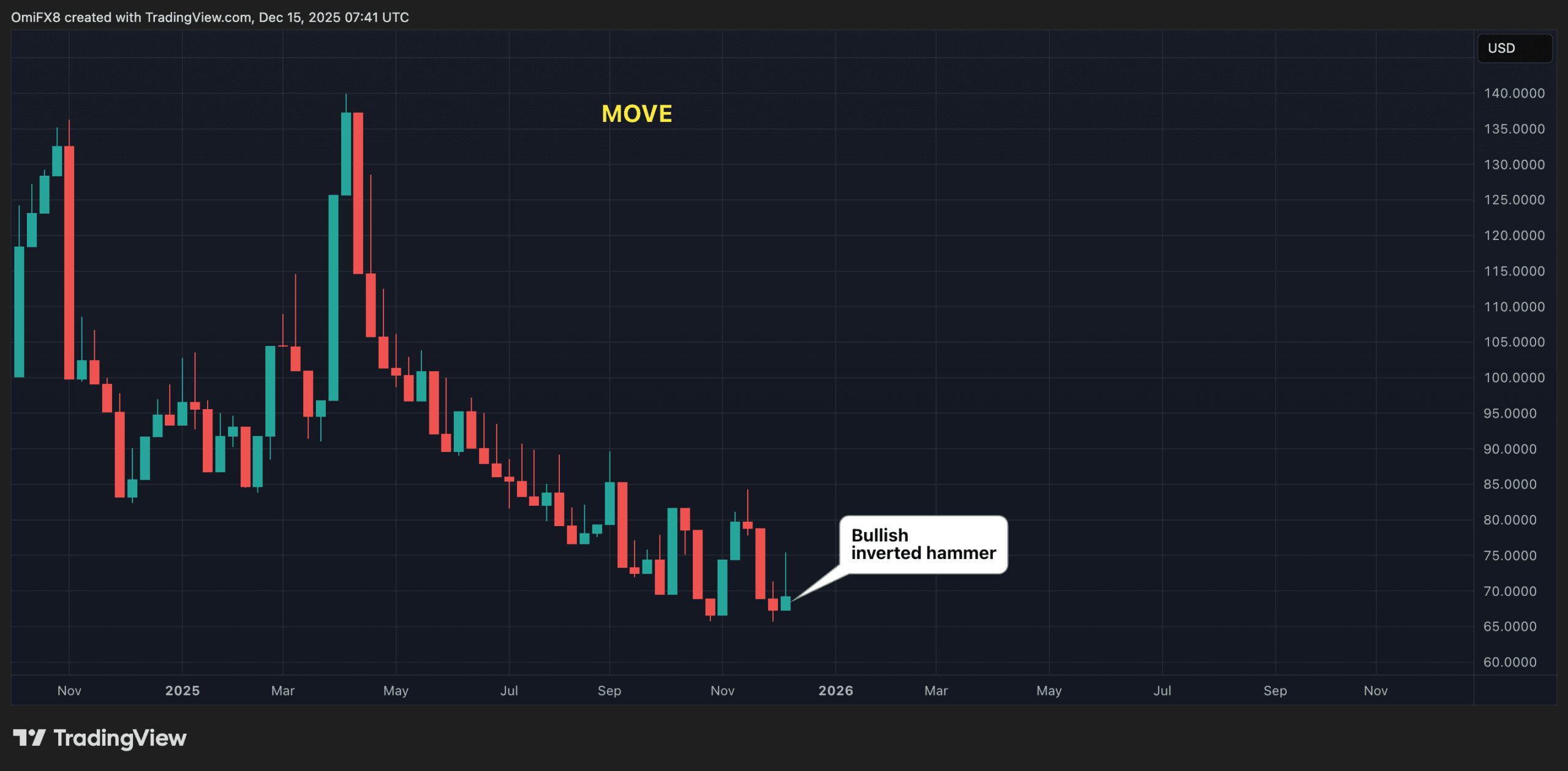 The MOVE index put in an inverted hammer candle last week. This candlestick pattern, appearing after a prolonged downtrend as in MOVE’s case, is taken to represent an early sign of bullish revival.
