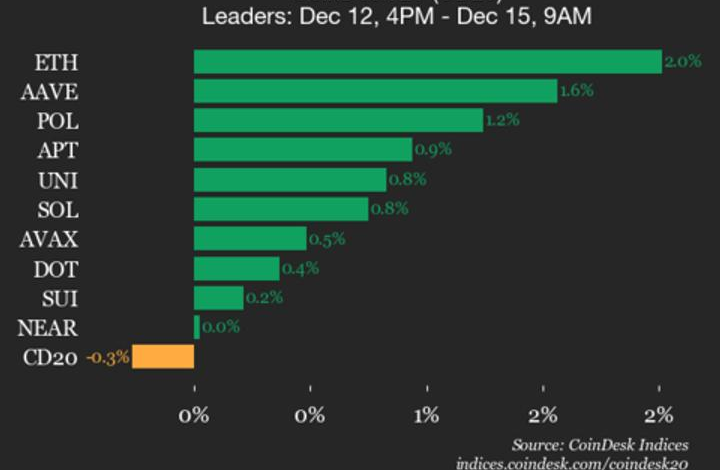 Leaders: ETH (+2.0%) and AAVE (+1.6%).