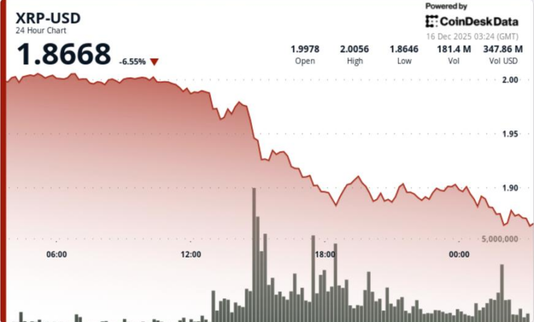 - XRP traded sharply lower during the latest session as broader crypto markets faced renewed risk-off pressure.