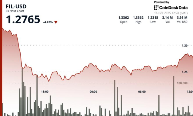Filecoin fell 4.2% to $1.28 on Tuesday amid significant volatility as traders drove sharp reversals during a broader market decline, according to CoinDesk Research’s technical analysis model.