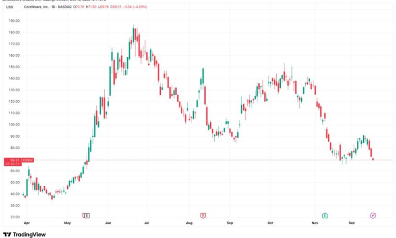 CoreWeave (CRWV) has seen its share price fall more than 60% from its June record amid growing concerns that the AI infrastructure boom may have peaked.