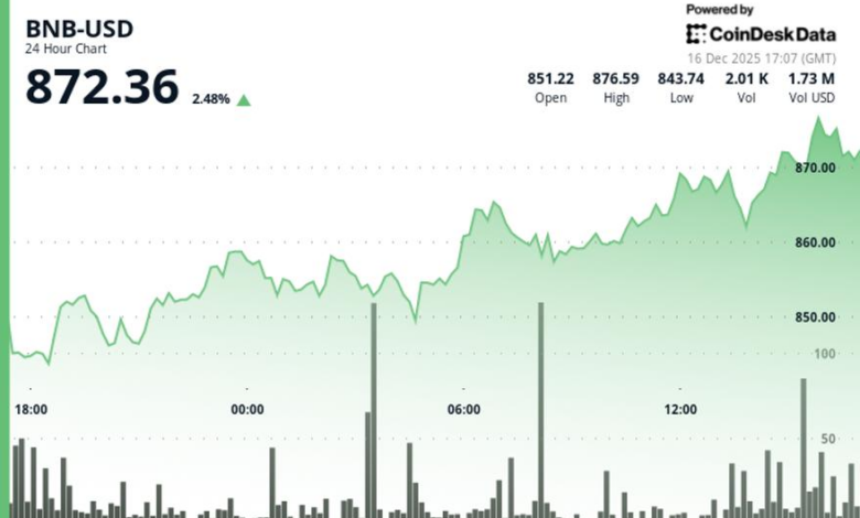 BNB extended gains over the past 24 hours, rising nearly 2.5% to trade at $872 amid a broader cryptocurrency market recovery that saw the CoinDesk 20 (CD20) index rise 1.4% in the same period.