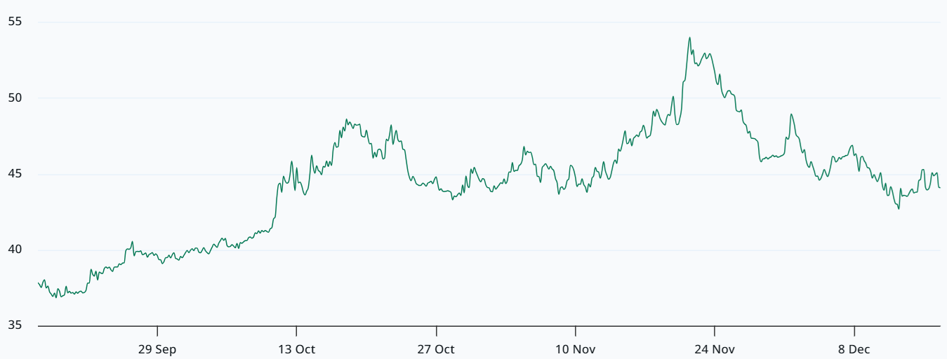 Bitcoin options’ implied volatility peaked at 53% in November, roughly in line with the current level for Tesla (TSLA US). When traders anticipate sharp price swings, this metric rises to reflect the higher premiums charged on call (buy) and put (sell) options. Market makers tend to reduce risk exposure when surprise price moves are more likely; however, this does not necessarily mean investors have turned bearish.