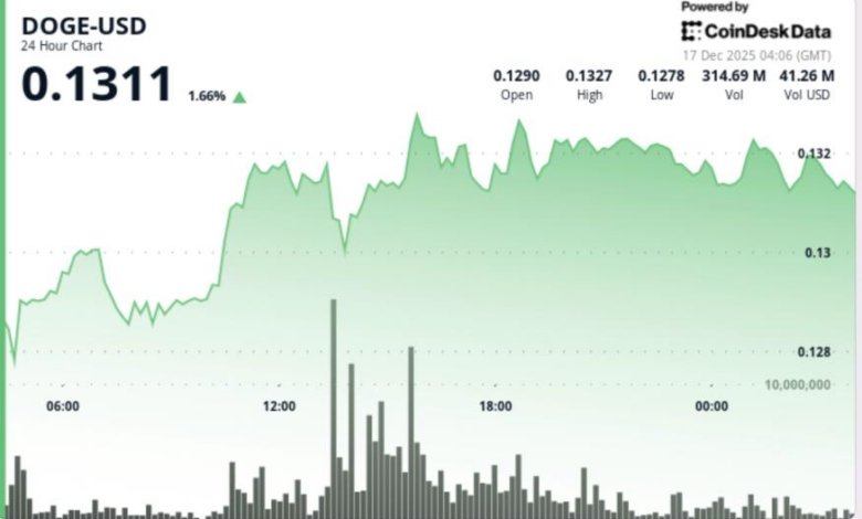 The recovery, however, occurred on fading volume and left price below key moving averages. Overnight trading showed continued pressure, with DOGE slipping from $0.1320 to $0.1314 on steady but controlled activity, suggesting sellers remain active on rallies.