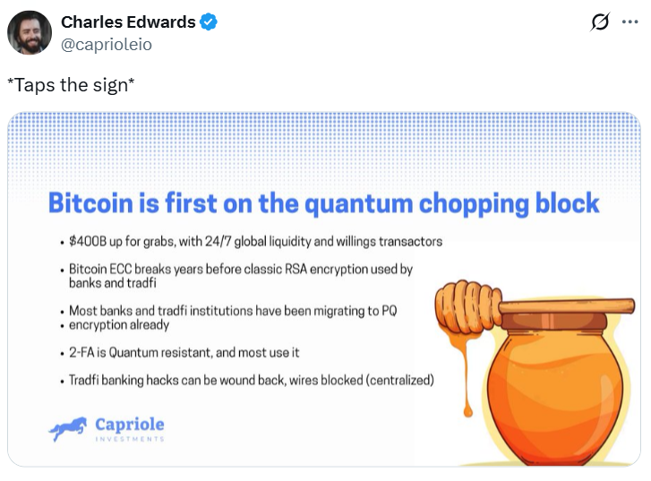 However, Edwards has long argued the threat is more imminent, that Bitcoin will be “first on the Quantum,” chopping block because most banks and institutions are already migrating to post-quantum encryption and fraudulent transactions can be wound back or blocked.
