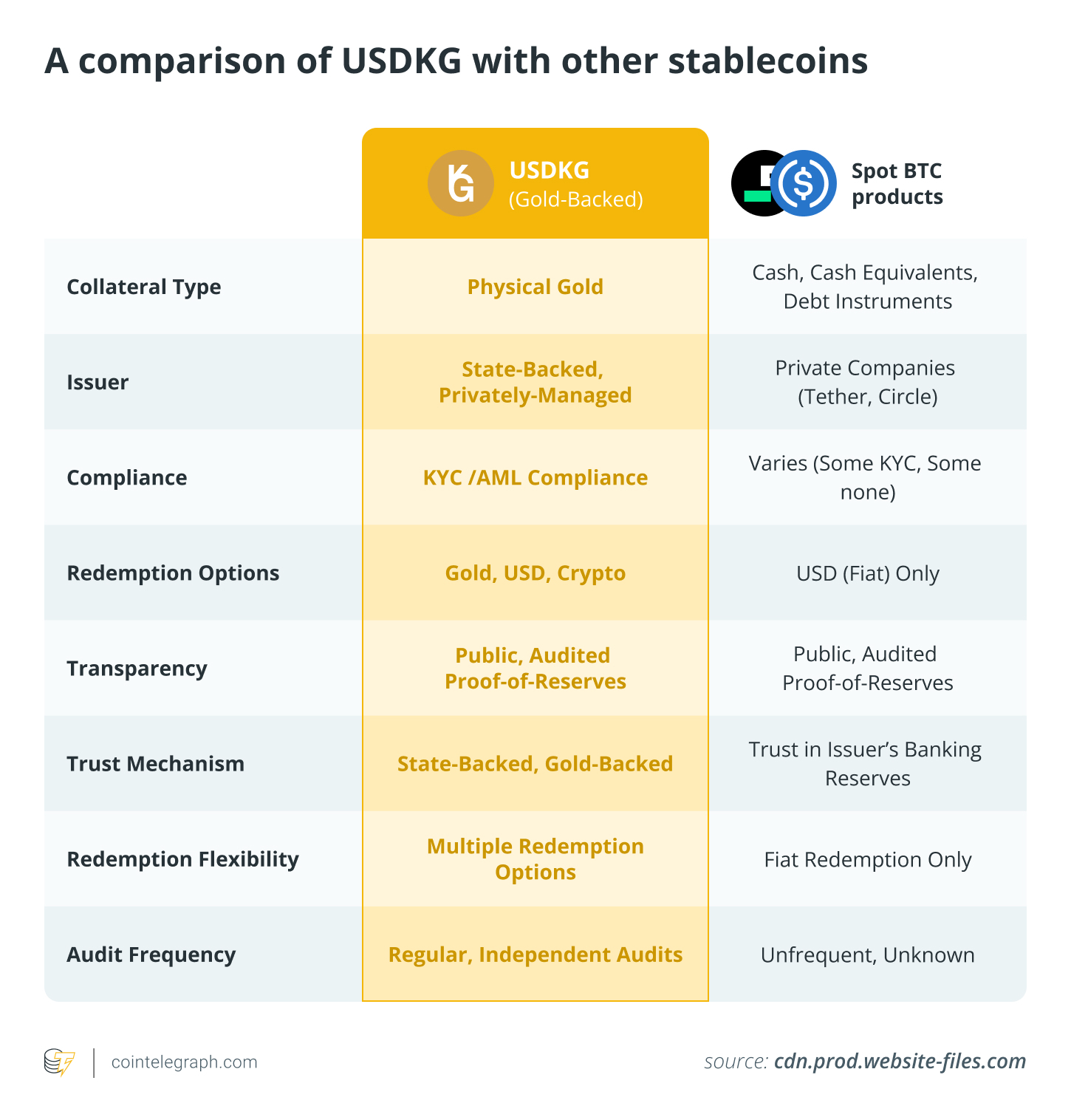 USDKG is positioned as a hybrid model, combining a USD unit of account with a gold-reserve narrative and a state-linked issuer structure.