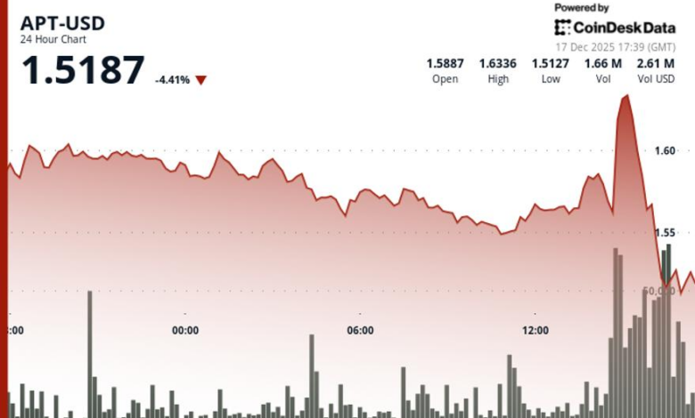 Aptos (APT) drops 5% to $1.50 as volume spikes above monthly average