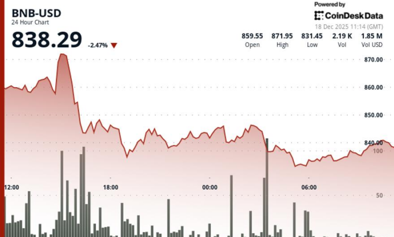Short-term charts show BNB could stabilize just above the $830 support area after multiple tests. A decisive break below that level could expose lower weekly levels near $709, while any rebound would need to clear $845 before challenging higher resistance again.