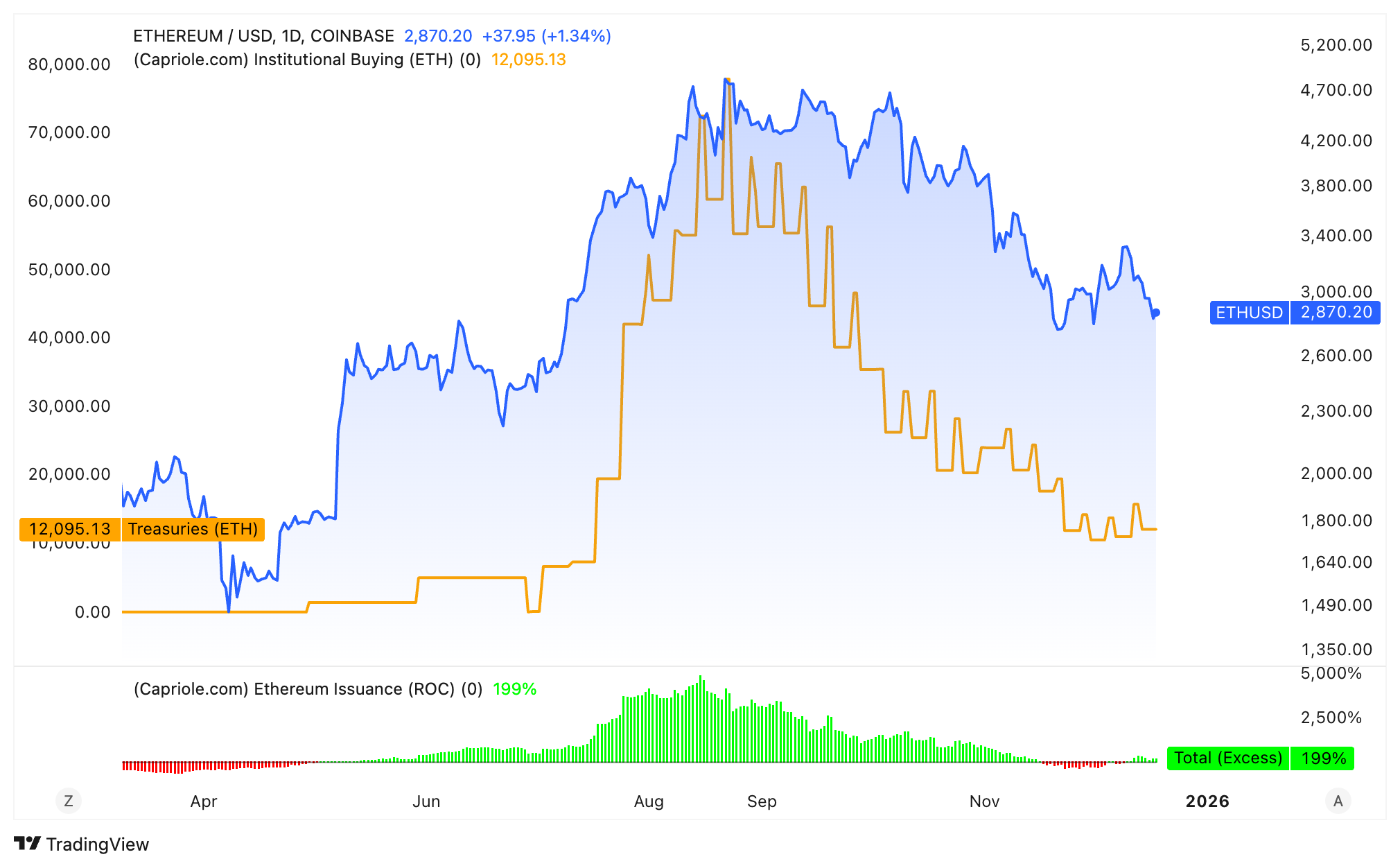 Additional data from Capriole Investments reveals that daily purchases by Ethereum treasury companies have dropped from a peak of 78,010 ETH on Aug. 23 to 12,095 ETH per day.