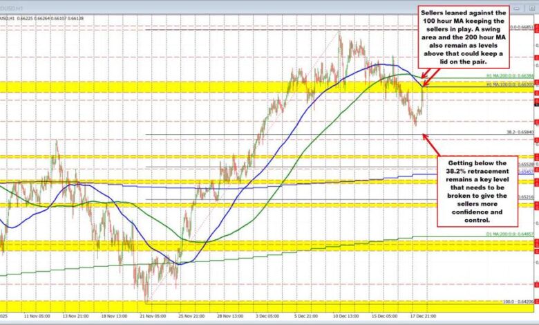 The Bearish View: Sellers remain in charge as long as the price stays below the 100-hour moving average and the 0.6635 swing level. Their immediate goal is a break through the 38.2% retracement at 0.6584. If they clear that hurdle, the correction is likely to accelerate.