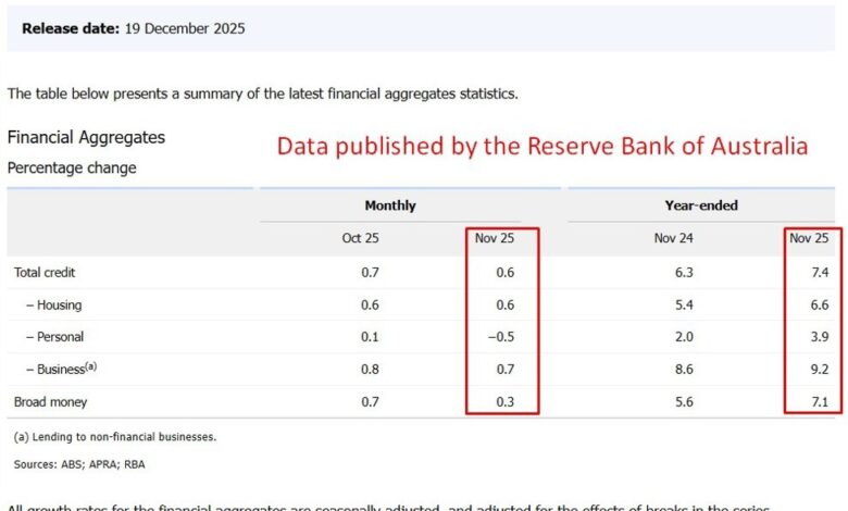Data published by the Reserve Bank of Australia showed private sector credit rose 0.6% month-on-month in November, in line with market expectations and only marginally softer than the 0.7% increase recorded in October. The result points to stable borrowing conditions across the economy, with neither a sharp acceleration nor a meaningful slowdown in credit demand.