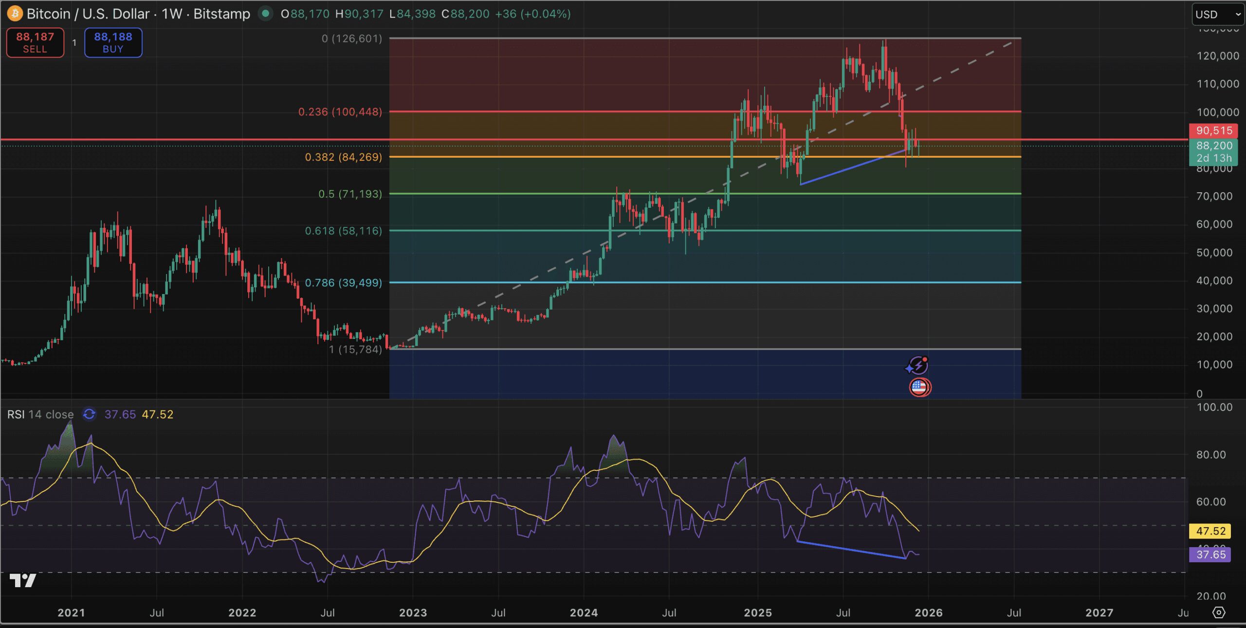 - BTC/USD is currently wedged between the $84,200 support and $90,500 weekly resistance. While the 0.382 Fibonacci level sits lower at $84,200, the current price action is holding above it, supported by a clear bullish RSI divergence where momentum is rising despite the price consolidation.