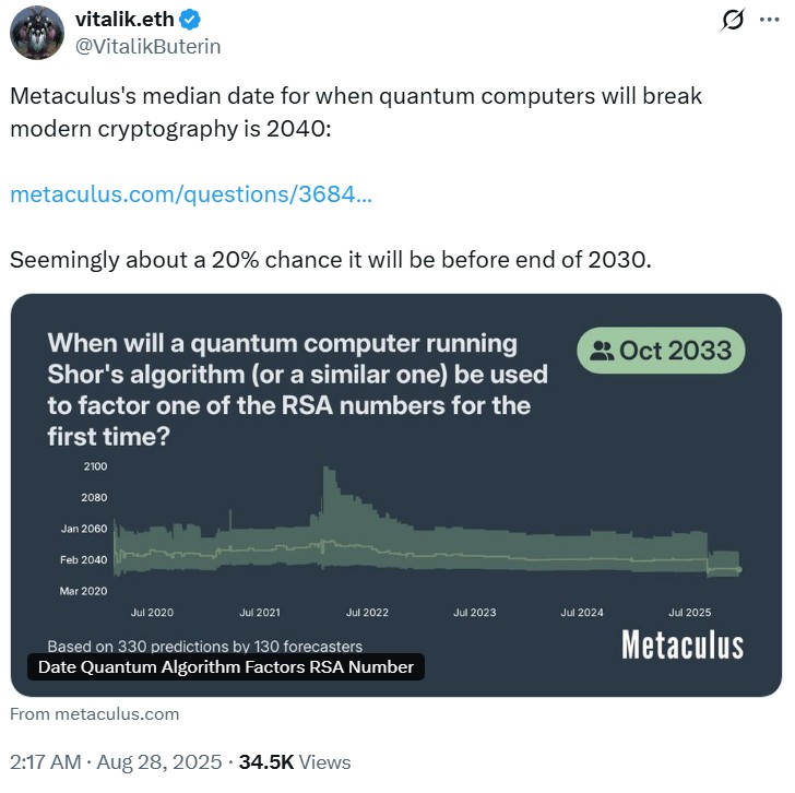 Citing forecasting models, he has said there is roughly a 20% chance that quantum computers capable of breaking today’s public-key cryptography could emerge before 2030, with a median estimate closer to 2040. Buterin reportedly said no machines exist today that can break Bitcoin or Ethereum, but waiting for certainty is itself risky, as migrating a global network to post-quantum schemes can take years.