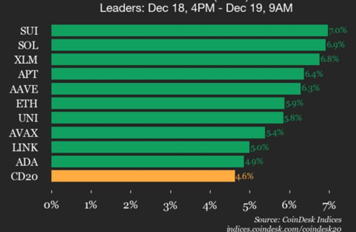 Leaders: SUI (+7.0%) and SOL (+6.9%).