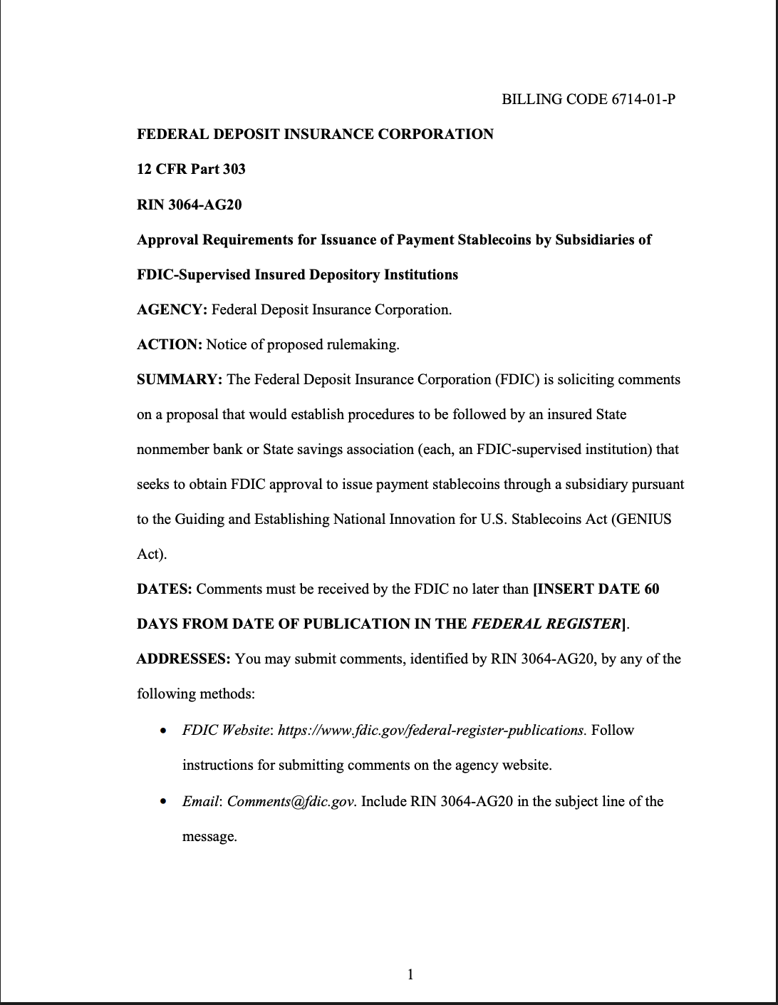 The Federal Deposit Insurance Corporation (FDIC), the US regulatory agency that oversees and insures the banking sector, published a proposal on Tuesday that would allow banks to issue stablecoins through subsidiaries.