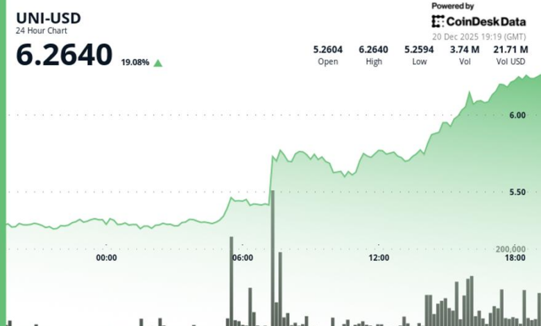 By around 19:30 UTC, UNI was trading near $6.27, up roughly 19% on the day. The move stood out against a relatively muted broader market, with bitcoin consolidating near $88,300 and ether trading slightly lower around $2,976. The overall crypto market capitalization was up about 1% over the same period, underscoring UNI’s relative outperformance.