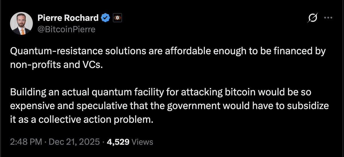 “Quantum-resistance solutions are affordable enough to be financed by non-profits and VCs,” Bitcoin maximalist Pierre Rochard said.