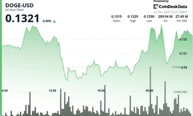 - DOGE slipped roughly 0.3% over the 24-hour period ending Dec. 22, trading down from $0.1309 to $0.1305 after failing to hold support that had contained price action for several sessions.