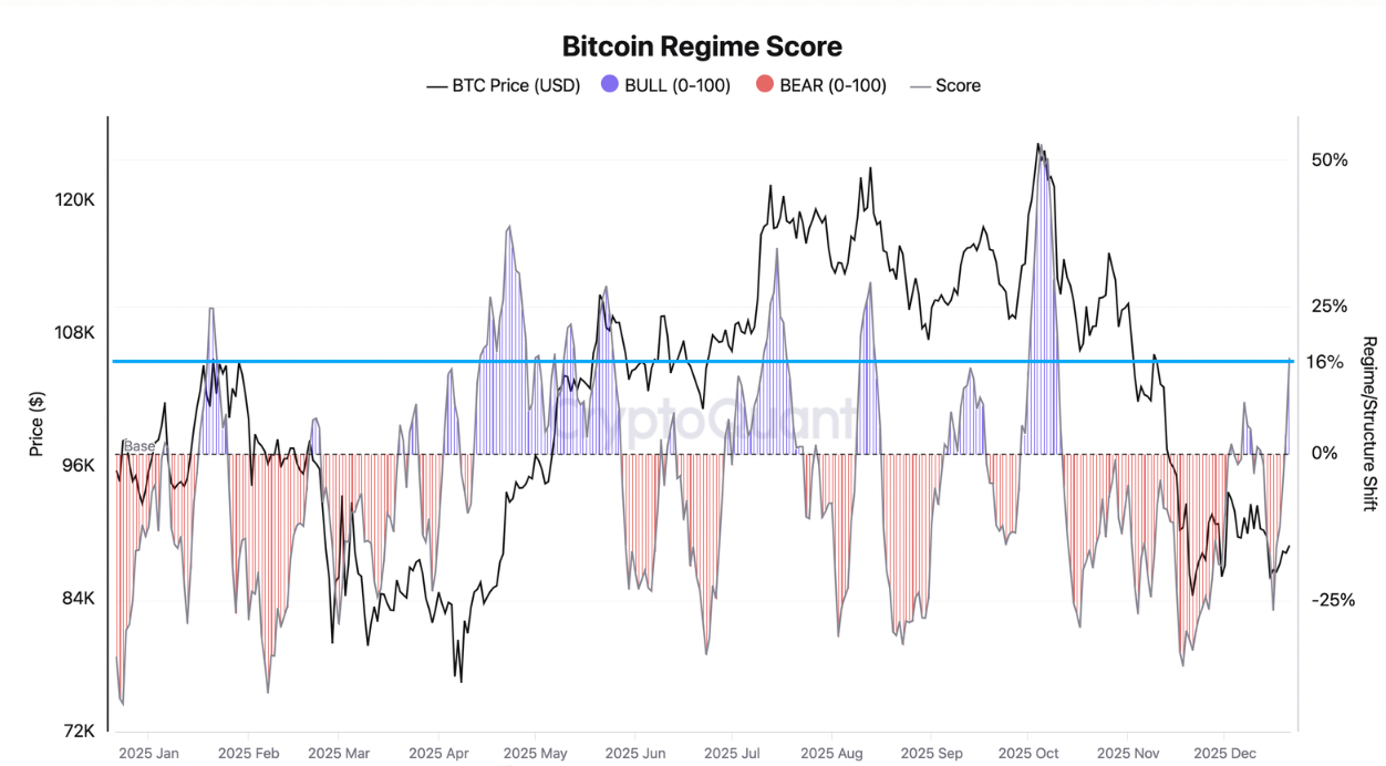 The chart below shows that Bitcoin’s regime score is at 16.3%, placing the BTC/USD pair in the upper neutral zone, a historically bullish signal.