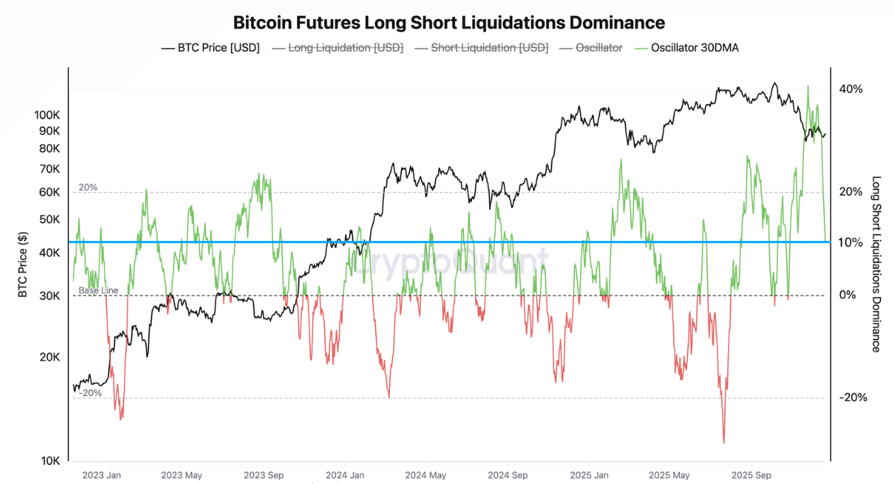 The long/short liquidation dominance oscillator has dropped to -11%, signalling a surge in forced short position closures, while its 30-day moving average remains positive at 10%, as shown in the chart below.