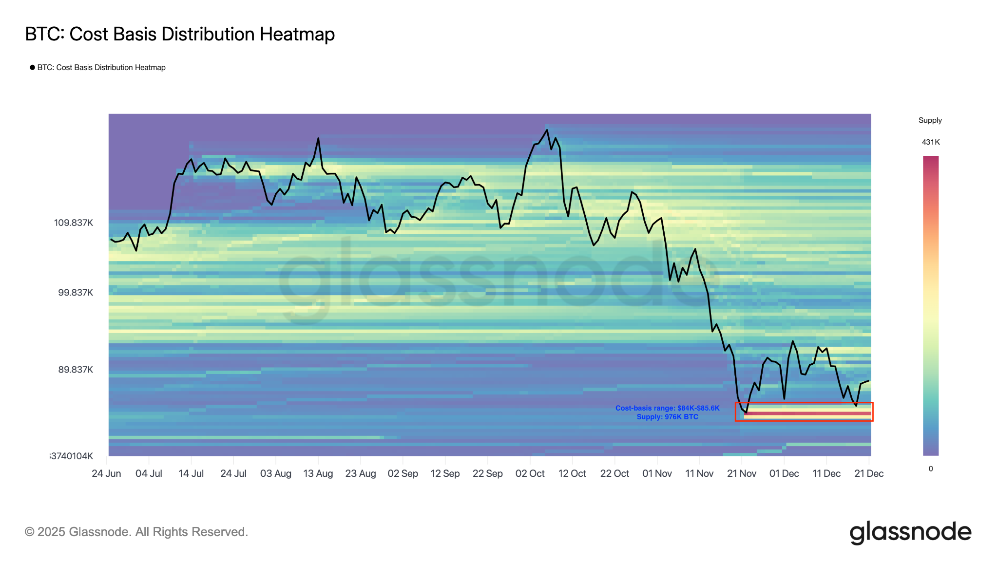 Glassode’s cost basis distribution heatmap reinforces the importance of this level. The immediate support sits at $84,000-$85,600, where investors acquired about 976,000 BTC.