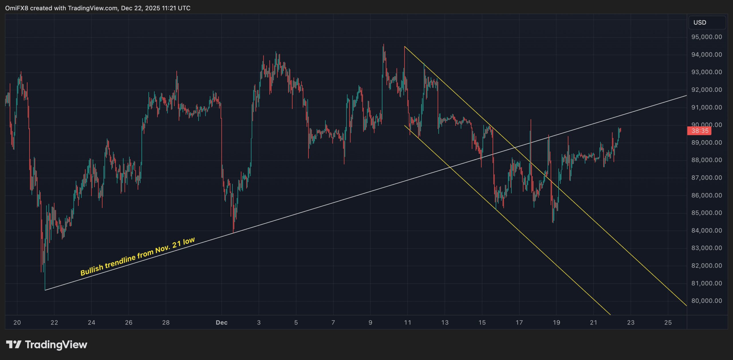 - A clean break above the rising trendline off Nov. 21 lows would cement the immediate bullish outlook, exposing the supply zone of $92,000-$95,000.