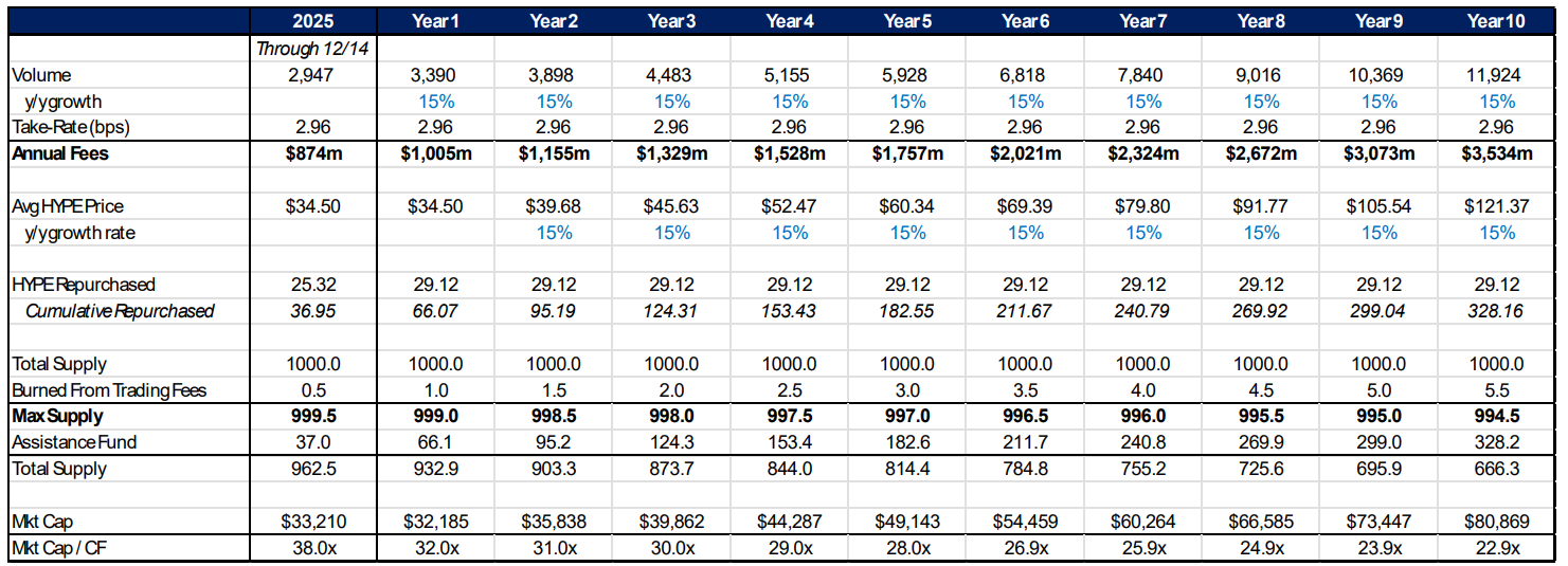The company’s prediction assumed that the token’s price will grow at a 15% compound annual growth rate (CAGR) while the Assistance Fund will repurchase about 291 million HYPE tokens, reducing the total supply to 666 million tokens.