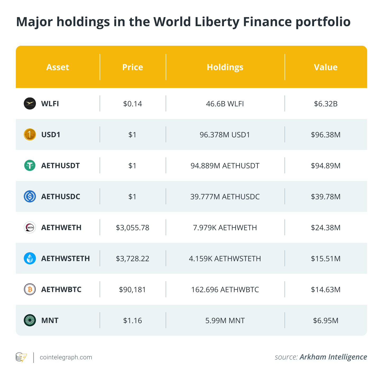 In the bull run that defined much of the 2025 crypto market, WLFI made several large cryptocurrency acquisitions. It bought millions of dollars’ worth of a basket of assets, including $21.5 million in Wrapped Bitcoin (WBTC), Ether (ETH) and Move (MOVE). As of Dec. 22, top coins in the fund also include substantial holdings of USD1, several Aave-tied assets, as well as Mantle (MNT).