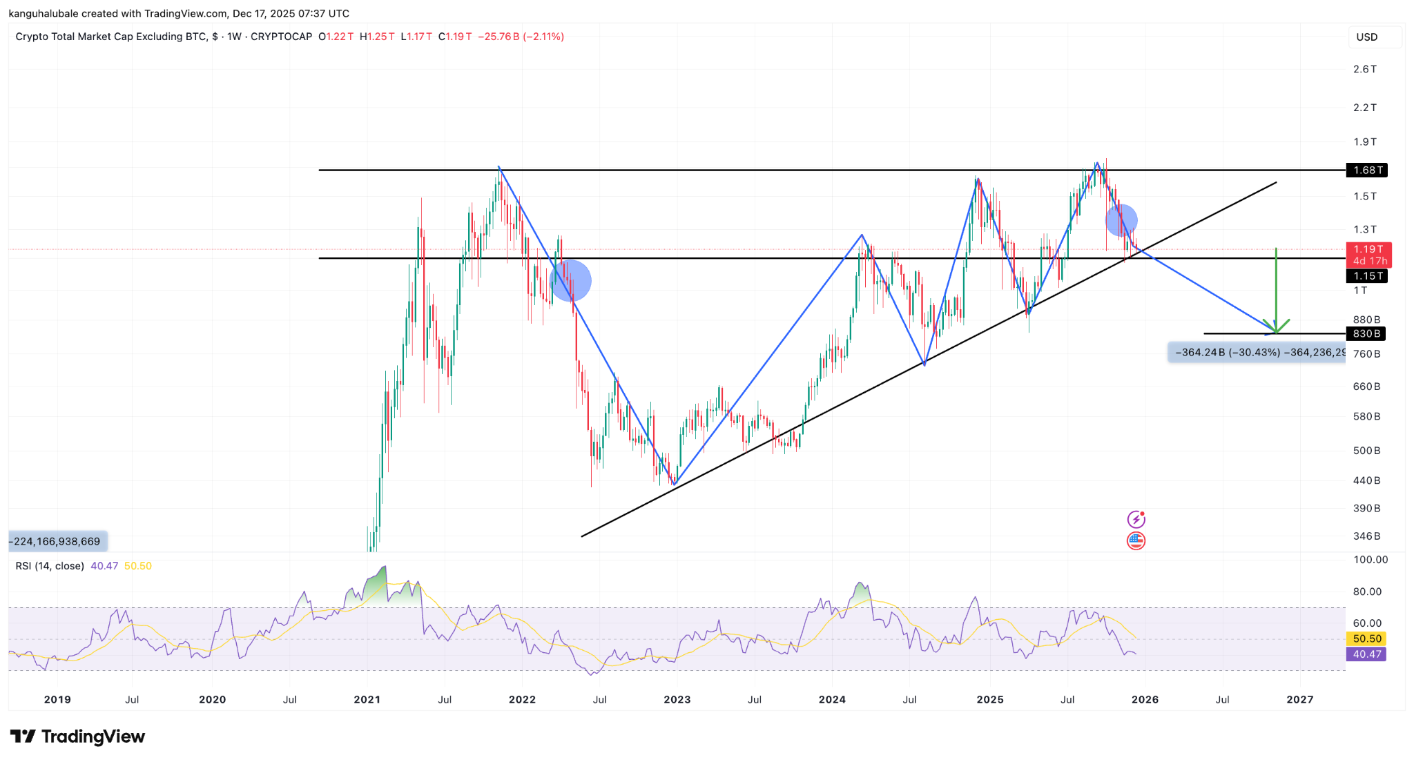 Support at $1.15 trillion is holding for now, but “if this triangle breaks, we could see a -30% flush” to $830 billion, the analyst said, adding that the “altseason is not coming” until the resistance at $1.68 trillion is broken.