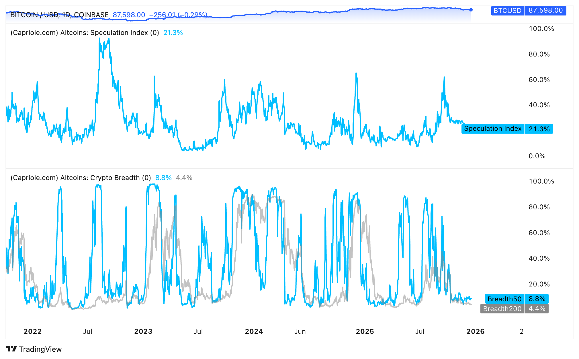 According to Capriole Investments’ Altcoin Speculation Index, only 21% of the top altcoins have outperformed BTC during the last three-month period, suggesting capitulation among altcoin holders.