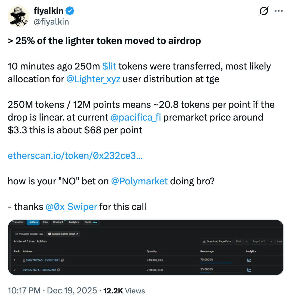 Lighter transferred 250 million LIT tokens — representing 25% of the total supply — on Friday, sparking community speculation that the move signaled an upcoming user airdrop ahead of the TGE, expected by Dec. 31.