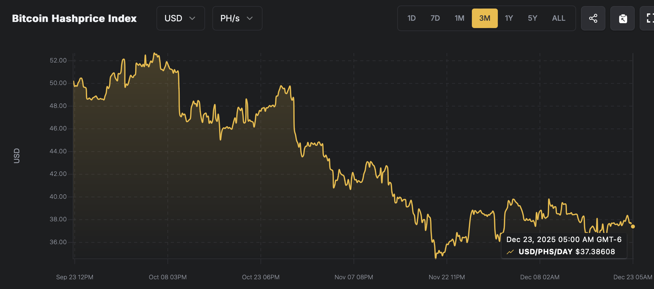 The Bitcoin mining hash price, a key measure of miner revenue per unit of computing power, has been below $40 since mid-November, a level many operators view as breakeven. The slump has forced mining companies to reassess their operating models as margins across the sector remain under pressure.