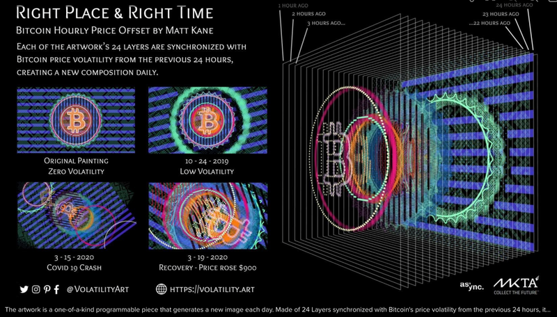 In 2020, a San Francisco–based group working in programmable digital art unveiled an artwork designed to change its appearance in line with Bitcoin’s price movements. The project, Right Place & Right Time by artist Matt Kane, used BTC market data as a live input, allowing shifts in the cryptocurrency’s value to drive visual changes in the piece.