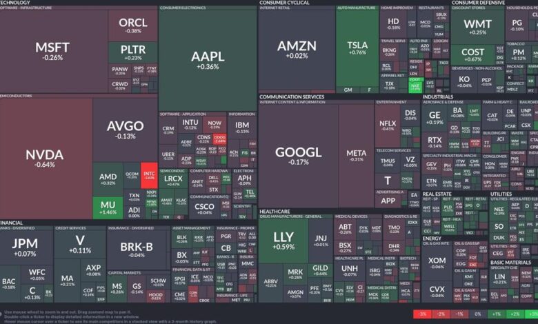 In today’s market snapshot, the overall sentiment appears cautious with the technology sector exhibiting minor declines. Notably, Nvidia (NVDA) has slipped by 0.64%, leading the sector’s retreat. Meanwhile, Oracle (ORCL) marked a decrease of 0.38%.