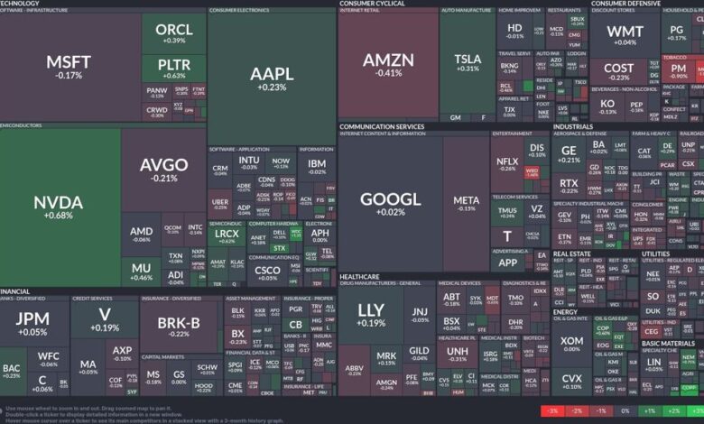 • Technology Sector: The technology sector shows promise with NVDA leading gains at 0.68%, highlighting positive investor sentiment. ORCL and PLTR also showcase mild additions of 0.39% and 0.63% respectively, reflecting ongoing strength in software infrastructure.