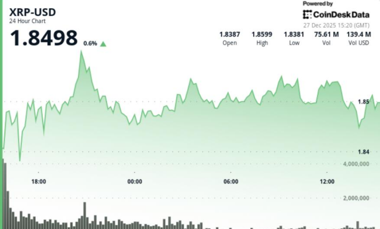 - XRP slid from $1.8783 to $1.8604, staying locked in a $1.85–$1.91 range