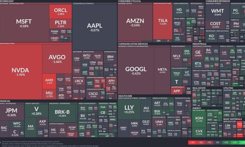The stock market today paints a somewhat mixed picture as observed through the heatmap, with a notable decline in semiconductor stocks. The semiconductor sector is glowing red with significant declines. Nvidia (NVDA) is leading the downturn, falling by 1.96%, while AMD and AVGO are also suffering losses at 2.35% and 1.46%, respectively. This trend hints at increasing caution or profit-taking among investors within the semiconductor space.