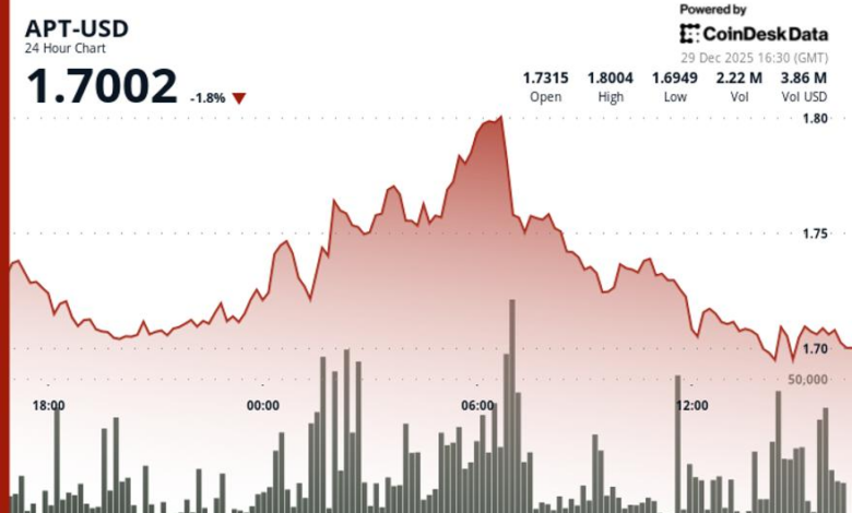 The declined occurred against a backdrop of notably subdued trading activity, with APT’s volume running 16% below its 30-day average, suggesting limited institutional conviction behind the price advance, according to CoinDesk Research’s technical analysis model.