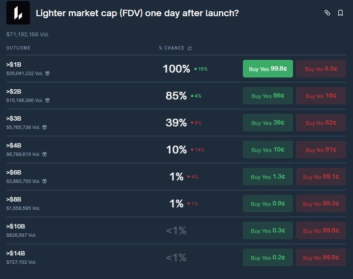 The market priced a near certainty bet that LIT would at least exceed $1 billion FDV, while confidence dropped above the $2 billion and $3 billion range.
