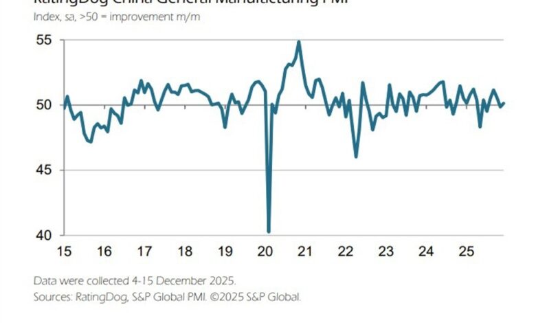 China S&P Global/Rating Dog December 2025 Manufacturing PMI 50.1 (expect 49.8, prior 49.9)