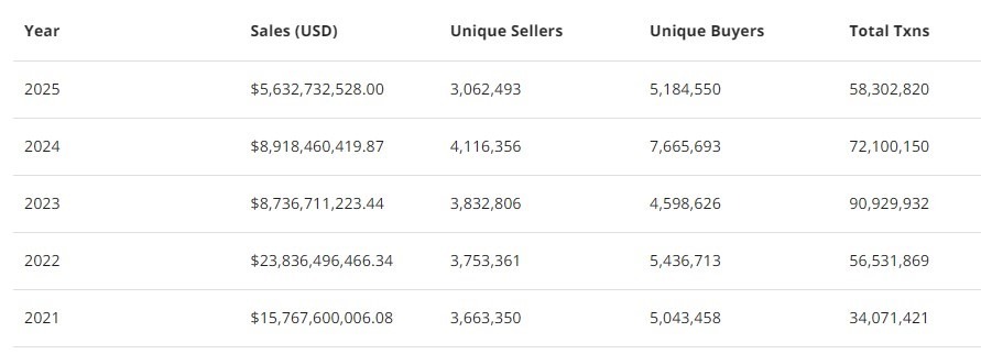 According to CryptoSlam data, NFT sales reached about $5.63 billion in 2025, down by about 37% from the $8.9 billion recorded last year. Average sale prices also declined year-on-year, slipping to $96 from $124.