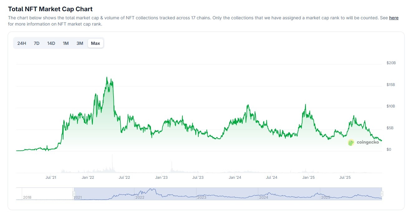 The NFT sector’s total capitalization has steadily declined since reaching a peak of about $17 billion in April 2022, reflecting the unwinding of speculative excess from the previous cycle.