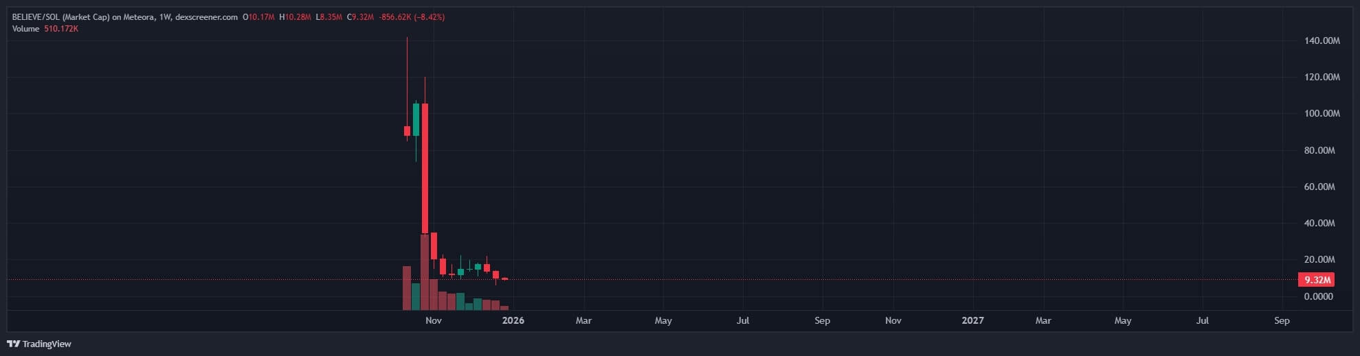 By late 2025, the flagship token had been rebranded to BELIEVE and was trading around $0.007, with a market cap of nearly $9.5 million.