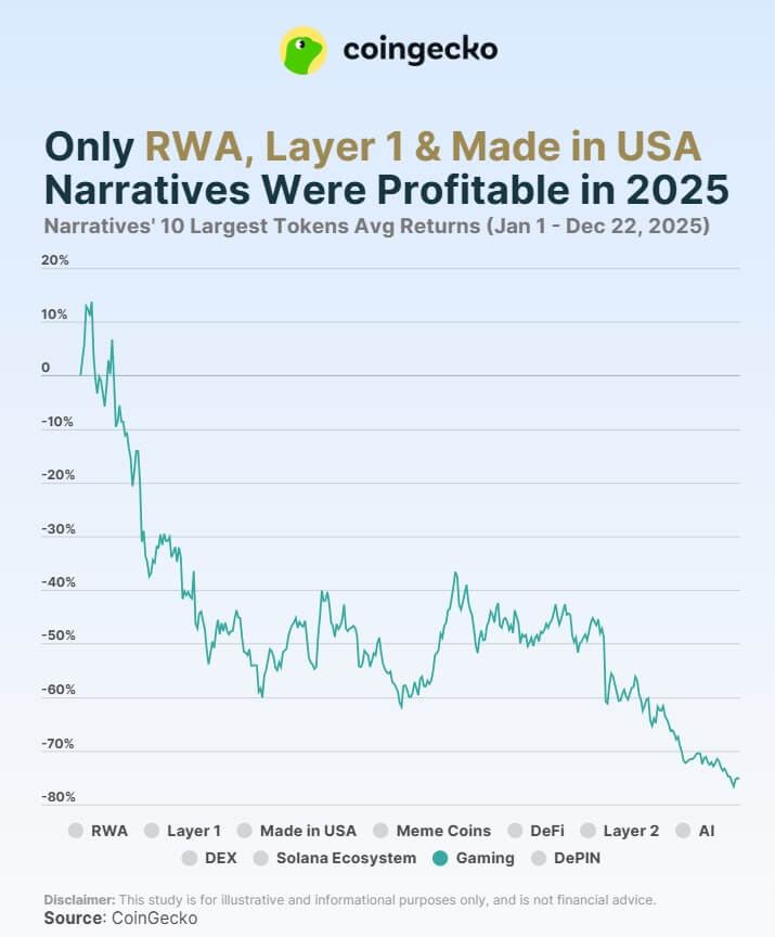 GameFi’s 75% decline in 2025 represented a complete reversal from its moderate gains in prior years, making it one of only two narratives, alongside DePIN, to post losses exceeding 70%.